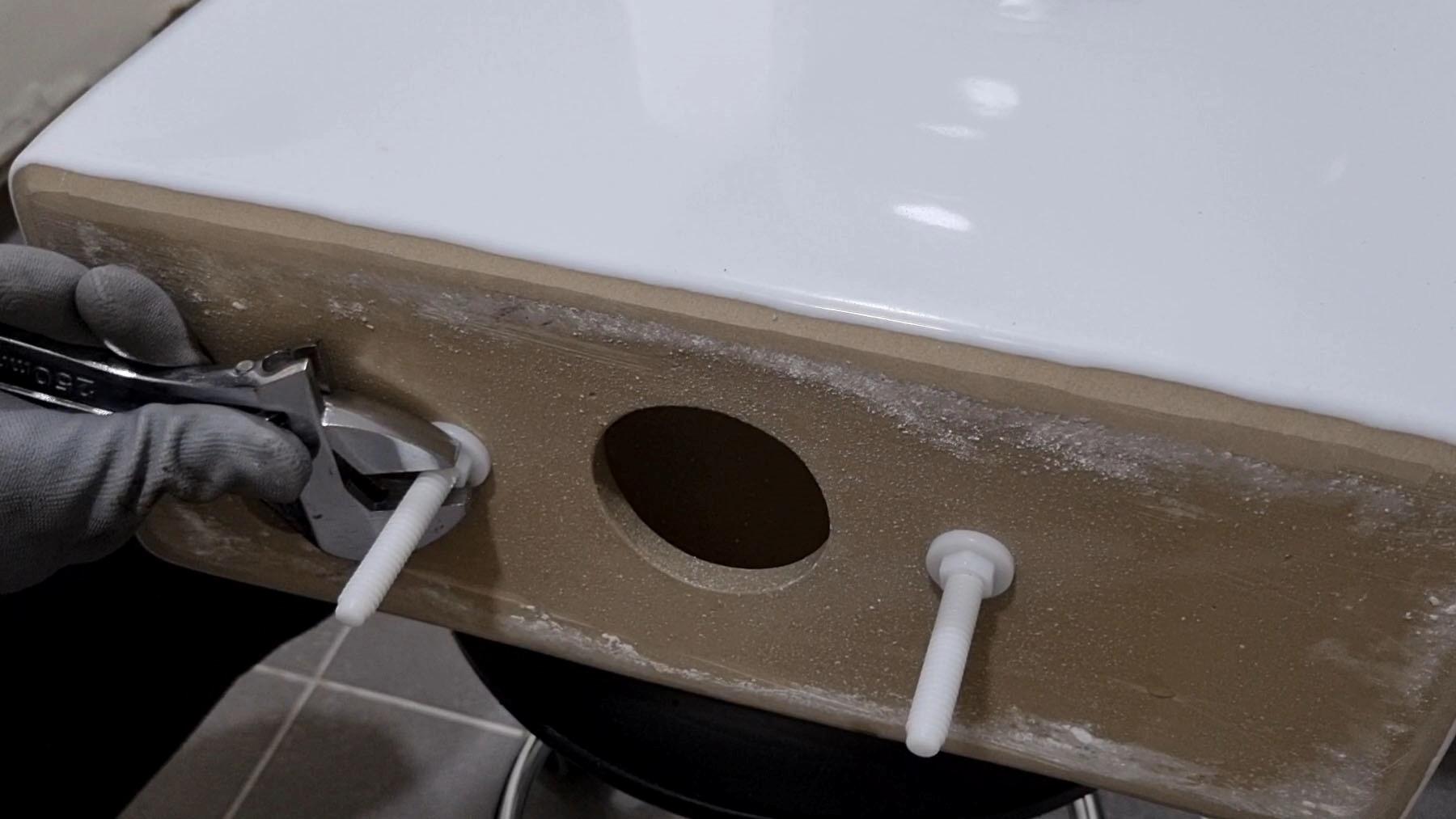 주의 : 양변기 아래에는 물탱크 고정 너트 외에 변기 커버를 고정하는 너트도 있으며 두 너트를 혼동하지 않도록 주의합니다.