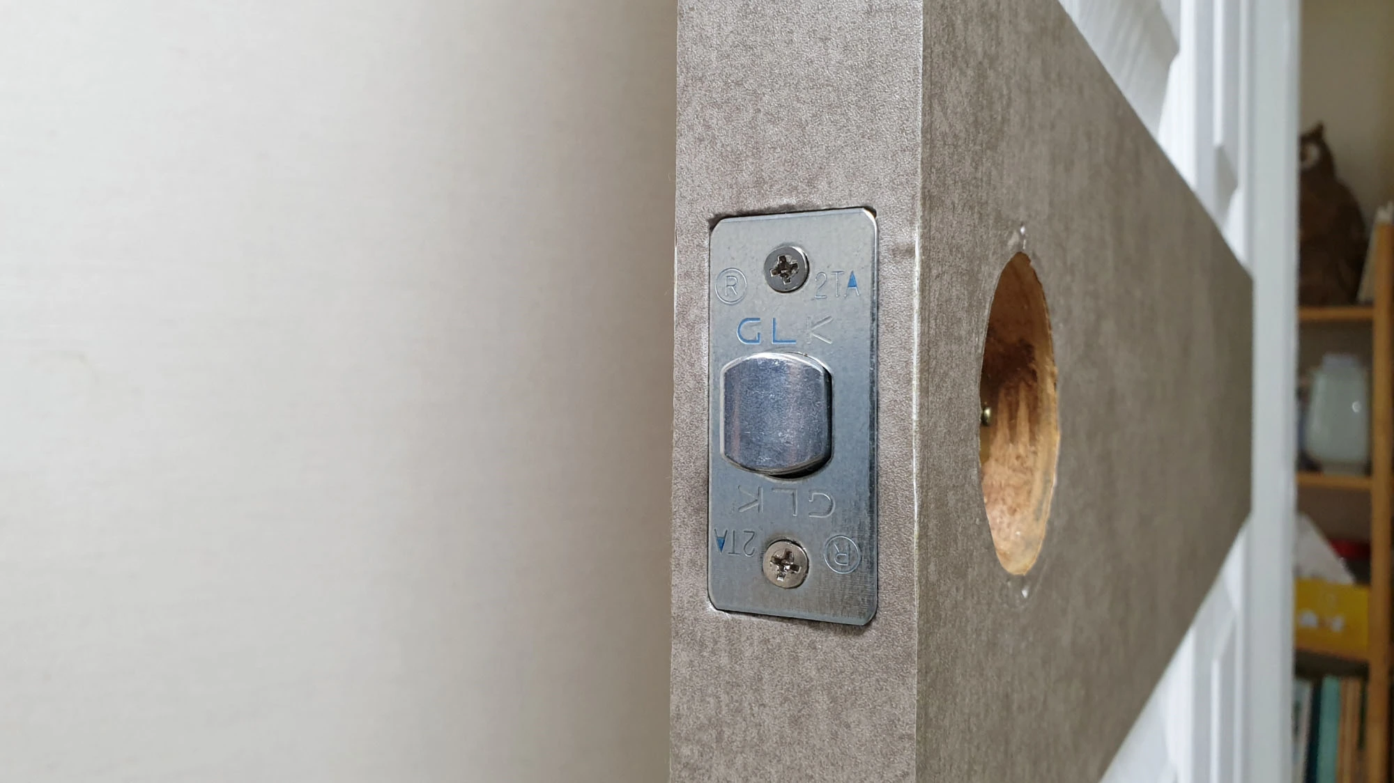 제가 설치한 레버식 문 손잡이는 잠금 버튼과 열쇠 구멍이 없기 때문에 고정 볼트를 끼울 수 있는 구멍이 있는 손잡이를 안쪽에 끼웠습니다.