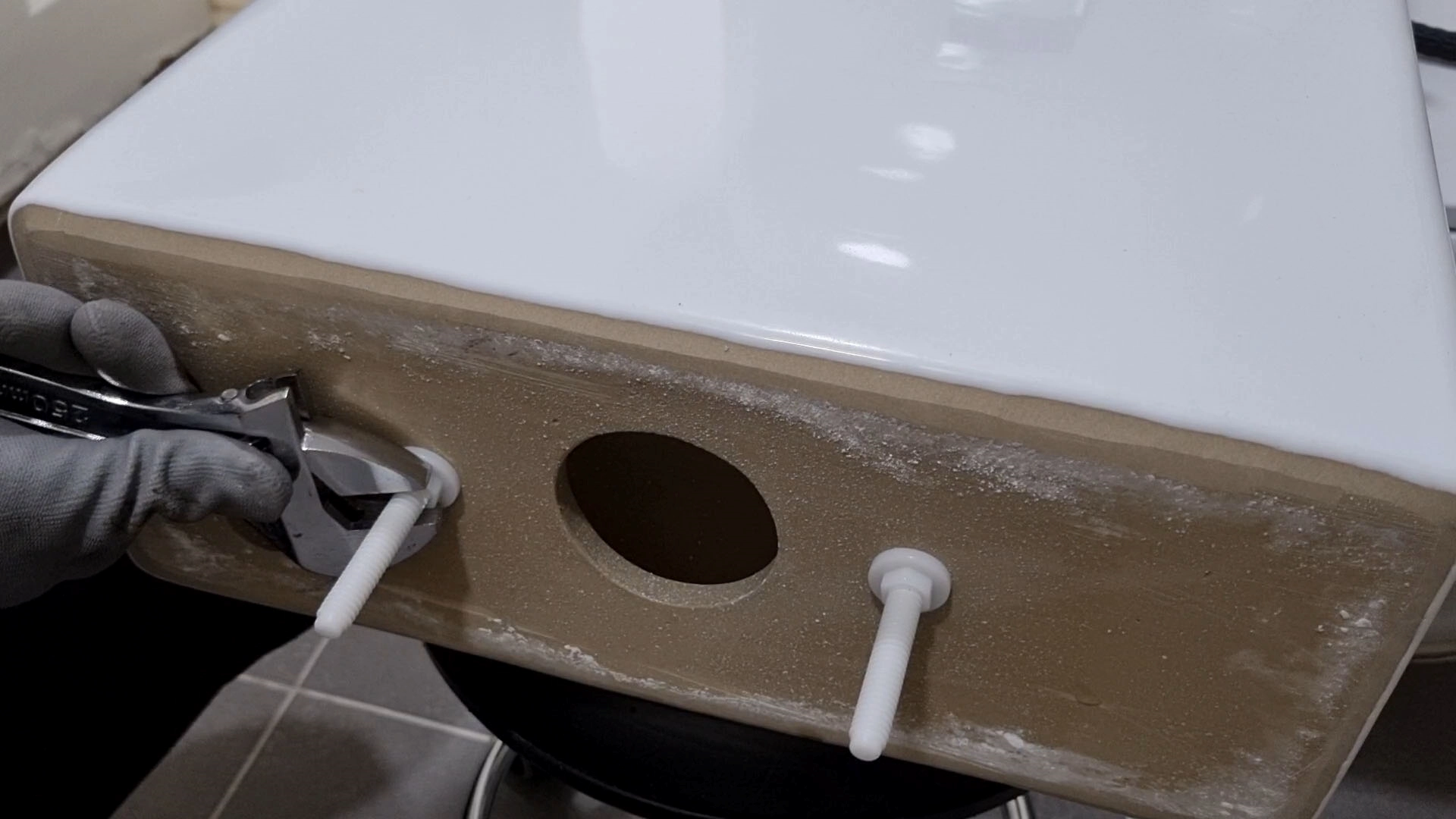 물탱크 고정 너트는 양쪽에 있으며 물탱크가 변기 위에서 흔들린다면 해당 너트를 시계 방향으로 돌려서 조여줍니다.