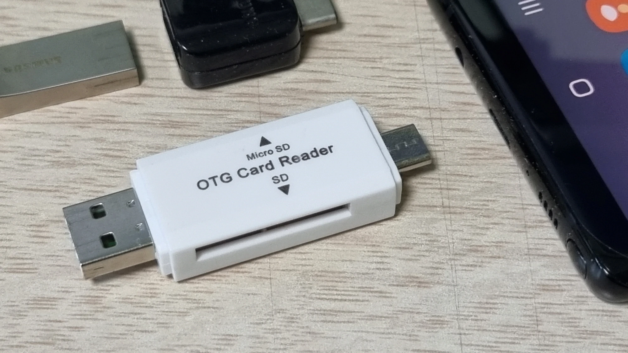 위에 OTG 카드 리더는 C타입 잭도 있기 때문에 휴대폰 충전단자에 바로 끼울 수 있지만 일반 USB 잭만 있다면 앞서 말씀드린 휴대폰 구성품에 젠더를 앞에 끼워야 합니다.