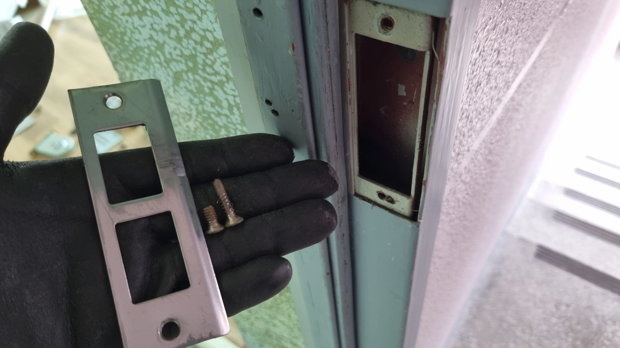 마지막으로 현관문에 붙어있는 설치보강판과 문틀에 있는 부품의 고정 볼트를 모두 풀어서 오른쪽 사진처럼 현관문에 달려있던 보조키 도어록을 완전히 떼어냈습니다.