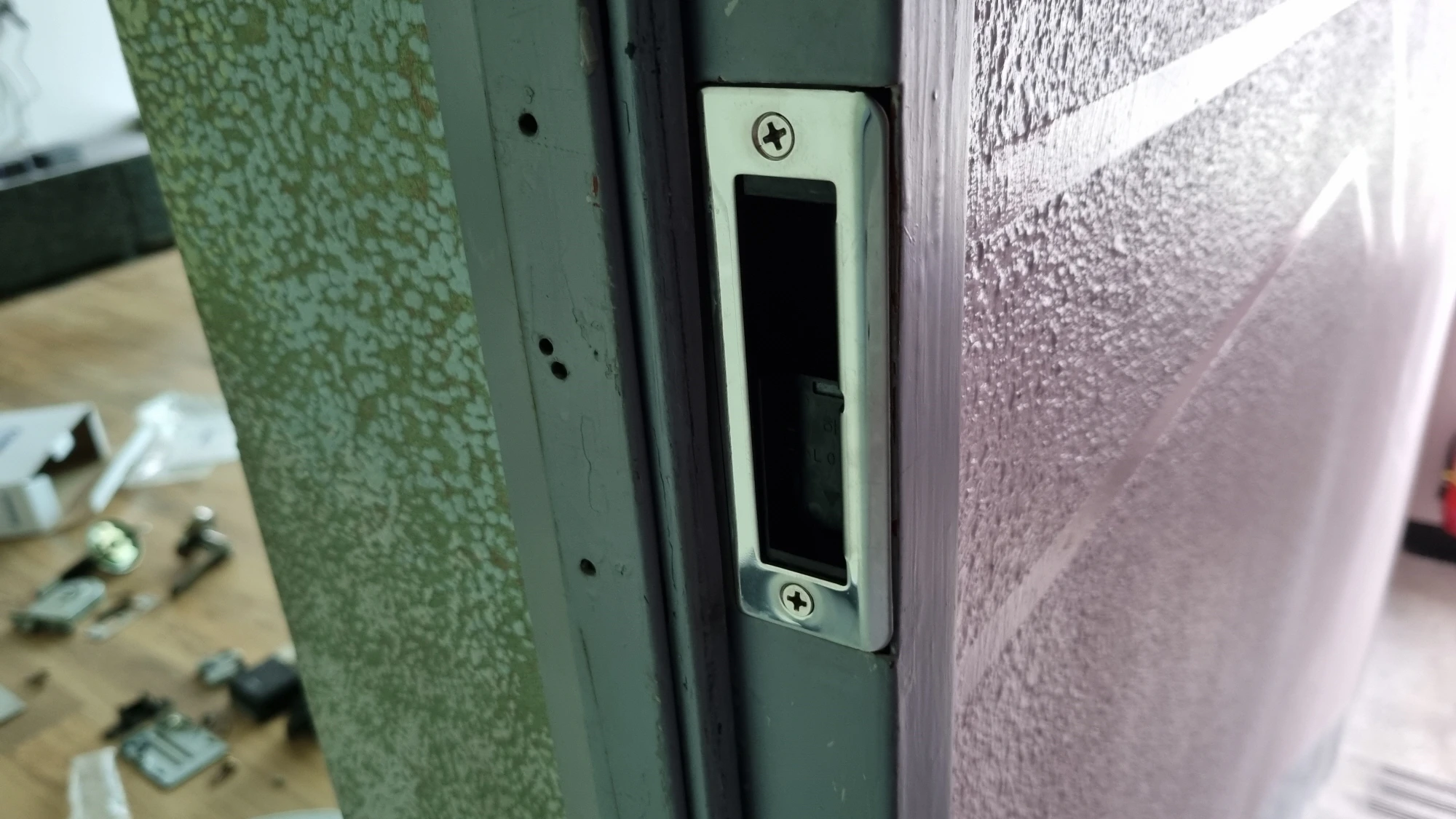 실외 도어록 끼운 모습도어록 설치 보강판실외 도어록 고정 볼트 위치