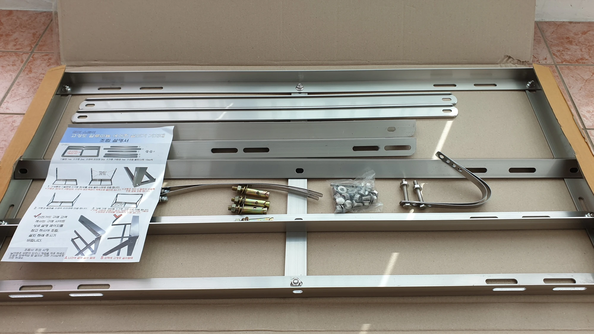 아파트 베란다 에어컨 실외기 거치대 설치하는 방법 설치 주의사항아파트 베란다에 에어컨 실외기 거치대를 설치하는 과정에는 사고의 위험이 있는 만큼 확실하게 알고 정확하게 할 수 없거나 미심쩍은 부분이 있다면 직접 셀프로 설치하기보다는 전문가의 도움을 받는 것이 안전합니다.에어컨 실외기 거치대는 실외기 크기에 맞는 규격의 제품을 준비해야 하며 실외기를 올렸을 때 문제가 없도록 단단히 고정할 수 있는 부품을 사용하는 것이 매우 중요합니다.에어컨 실외기 거치대 설치 주의사항실외기 거치대 조립 시 부상을 입지 않도록 장갑을 착용하고 볼트를 단단히 조여 조립해야 합니다.에어컨 실외기 규격에 맞는 거치대를 준비해야 합니다.거치대 고정 밴드 부품은 제품 하중을 충분히 견딜 수 있는 전용 부품을 사용해 고정합니다.에어컨..