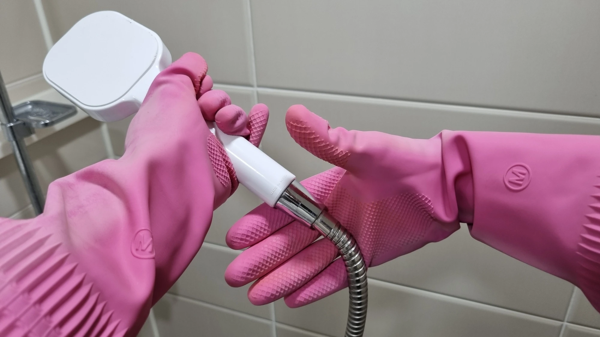 만약 샤워기 헤드 손잡이 표면과 호스 연결 부위가 미끄러워서 힘이 잘 들어가지 않는다면 헤드 손잡이와 호스 연결 부위의 물기를 완전히 제거하고 위에 사진처럼 고무코팅 장갑을 착용하고 돌리는 것이 도움이 될 수 있습니다.
