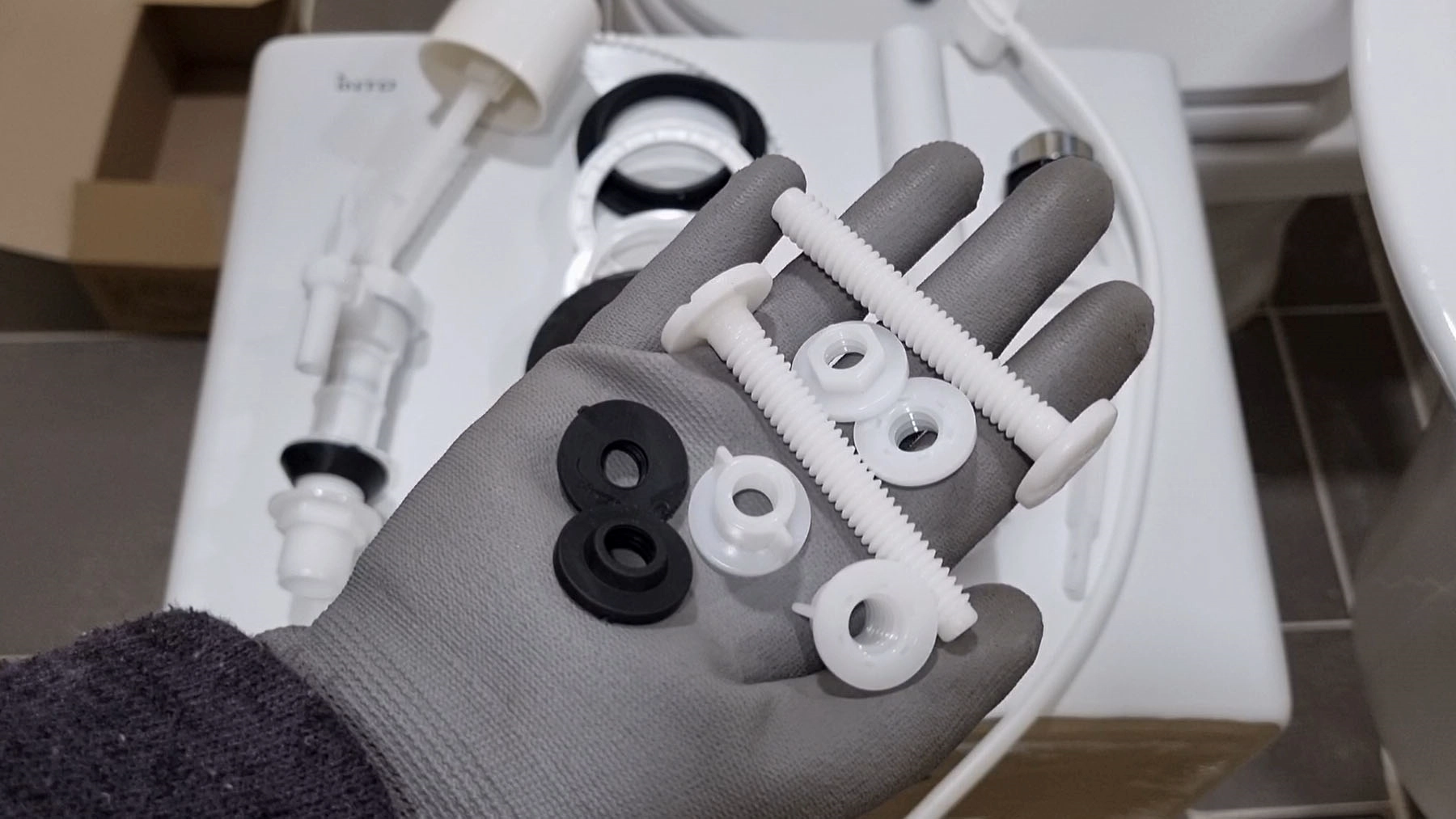 양변기 물탱크에 고정하는 장치들은 모두 패킹이 있으며 패킹을 빼놓으면 물샘 증상이 생길 수 있으니 빼놓지 않도록 신경 써서 끼워야 합니다.