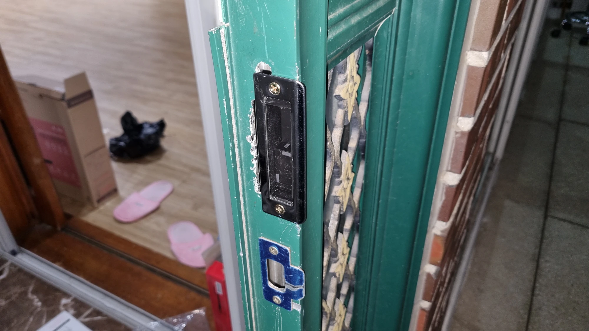 주의 사항 : 모티스를 고정한 후 문을 닫았을 때 문틀에 걸리지 않는지 확인을 해야 하는데 이 상태에서 현관문을 완전히 닫아서 걸쇠가 걸리게 되면 문을 열 수 없는 상태가 되기 때문에 주의해서 확인을 해야 합니다.