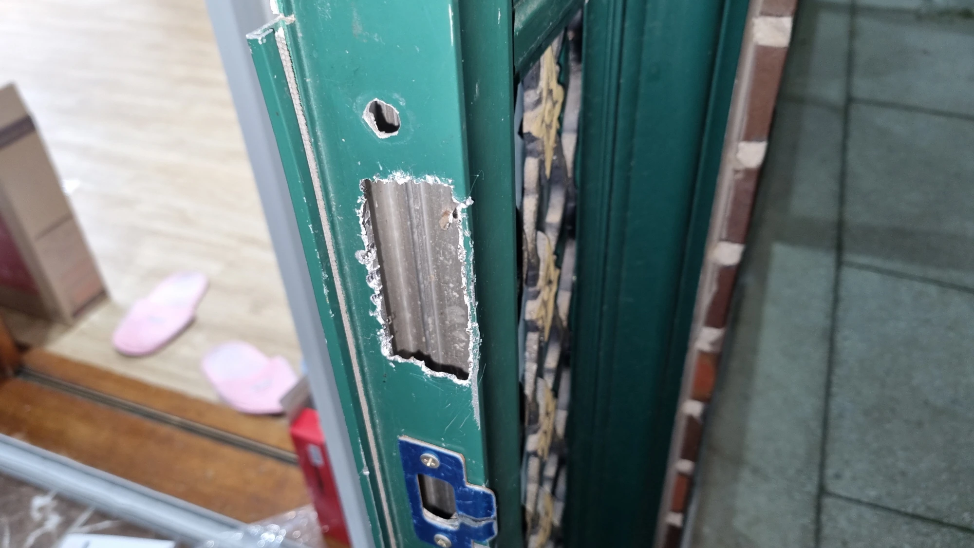 문틀에도 구멍이 맞지 않아서 왼쪽 사진처럼 홀커터와 드릴, 쇠톱을 이용해 구멍을 뚫었습니다.