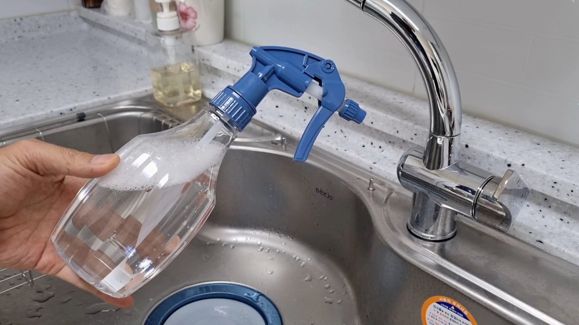 왼쪽 사진처럼 분무기에 물을 담고 주방세제를 2~3방울 넣고 잘 섞어줍니다.